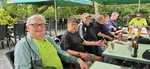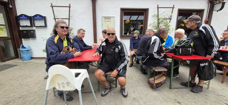 Einen ersten Sektumtrunk nahmen wir an der Schleuse Lingenfeld und der Dribbl kredenzte einen Grappa für de Babba. Da merkten wir schon, dass der Saarlänner Peter wieder sehr clever war. Sein Rad hatte nämlich Elektroantrieb, aber zum Glück waren die Temperaturen ideal zum Rad fahren und wir kamen nicht allzu sehr ins Schwitzen. Nächster Halt dann die Rheinpromenade Germersheim für einen Fotostopp. Der Radweg ist hier schön angelegt und so bietet sich das entsprechend an. Um die Mittagszeit waren wir an der Alten Ziegelei, um uns mit Kesselfleisch, Kraut und Brot zu stärken. Das waren noch Zeiten, als der Steier-Michel hier Schnüffel mit Pommes bestellte. Die Schnüffel bitte rasiert. Es is halt schä, wenn ´s schä is, beim Zugucken, wie die Schiffe vorbeiziehen und einen kühlen Rieslingschorle zu trinken. Die nächste Tankstation war dann der Waldgasthof Gut Altbrand in Sunnerem. Mit sonniger Laune und Live Musik war die gute Stimmung sicher. Nur der starke Polenflug machte manchem Allergiker zu schaffen. Doch gemäß unserem Motto „Immer weiter, immer weiter…“ schwangen wir uns wieder auf die Drahtesel und fuhren Richtung Speyer. Lecker Kaffee und Kuchen gab ´s dann in Westheim am Kiosk Bauer. Das liegt am Endpunkt der Draisinenbahn und ist ein echter Geheimtipp. Am Bahnhof Lingenfeld verabschiedete sich schließlich die erste Gruppe. Da der Peter einen russischen Jetlag bekam, hatte auch jeder dafür Verständnis, dass er die Heimreise antrat. Simon hatte nur einen Kritikpunkt. Er fand, dass wir einfach zu viele Pausen gemacht haben. Also strengt euch das nächste Mal ein bisschen mehr an. Der Rest schaffte es noch zum Sundowner beim FV Helschestää, um den Tag ausklingen zu lassen.