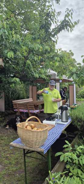 Anlässlich dieses Festes nahmen wir auch weltweite Grüße entgegen, z. B. von der Mosel und aus Igglem. „Das war mal ein richtig entspannter Vatertag, toll für alle Anwesenden, mit einem tollen Sonnenuntergang“, war die einhellige Meinung. Saarlänner Peter fasste dann zusammen: „Guter Gastgeber mit legendär gutem Kuchen, gute Gespräche und traumhaftes Wetter. So kann das Corona-Jahr weitergehen.“ Tatsächlich hatte uns Ursula einen leckeren Hefe-Nuss-Stollen gebacken. Die Würstchen von Ludwig ´s Grill wurden mit selbstgemachten Saucen vom Saarlänner Peter verfeinert. Das glich einer Geschmacksexplosion im Mund. Deshalb Dank an alle, die für das Gelingen beitrugen. Unser Gaade ist schon ein kleines Paradies.